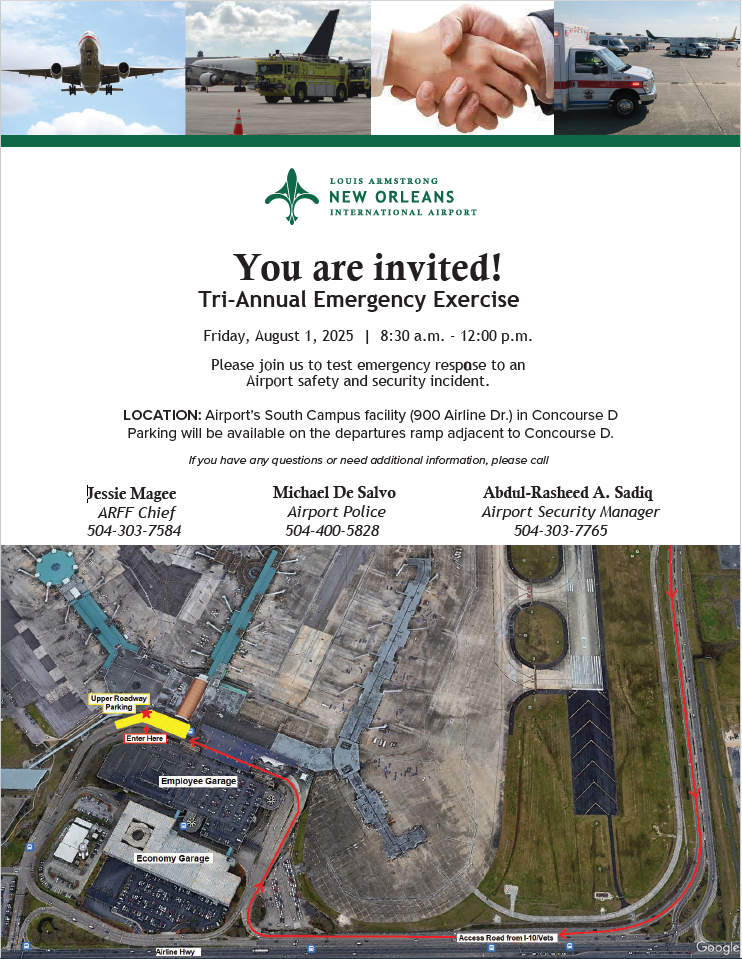 MSY Exercise The Louis Armstrong New Orleans International Airport will conduct an exercise on August 1, 2025 from 8:30 am to 12:00 pm to test the airports emergency response system should an incident occur. Volunteers are needed to play as passengers on a plane where an incident occurs resulting in injured passenger fatalities.